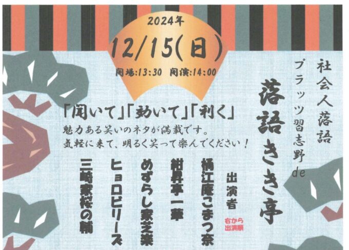 2024年12月15日(日)落語きき亭 2024年11月11日 2024年12月15日(日) 開演14:00~(開場13:30~) 社会人落語 落語きき亭 詳細はプラッツ習志野HPまたは047-476-3213までお問い合わせください。 « 前の記事「習志野市からJリーグへ」 » 次の記事次の投稿