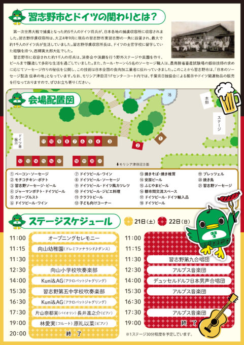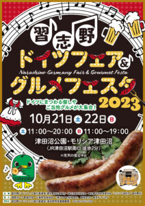 習志野ドイツフェア & グルメフェスタ 2023 @ 津田沼公園 2023年10月1日 習志野ドイツフェア&グルメフェスタ2023@津田沼公園 2023.10.21(土)11:00~20:00 2023.10.22(日)11:00~19:00 2023年10月21日(土)22日(日) 津田沼公園では「 習志野ドイツフェア & グルメフェスタ 2023 」が開催されます。日本初のドイツ式ソーセージ「習志野ソーセージ」の地である習志野市 秋恒例のイベントで、ドイツビールや飲食店自慢のグルメが集います。 « 前の記事2023.10.8(土)習志野きらっと2023 30th☆ » 次の記事2023.10.28(土)秋まつり(谷津遊路商店街)