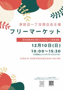 12月10日(日)津田沼一丁目商店会フリーマーケット開催します。 2023年11月28日 津田沼一丁目フリーマーケット 2023.12.10(日) 10:00~15:30 新京成津田沼駅からminaへの連絡通路 « 前の記事谷津遊路商店街歳末福引セール開催 » 次の記事プラッツ習志野オープン4th特別講演 川口成彦フォルテピアノ&ピアノリサイタル