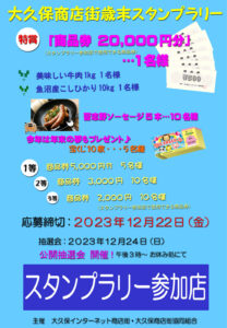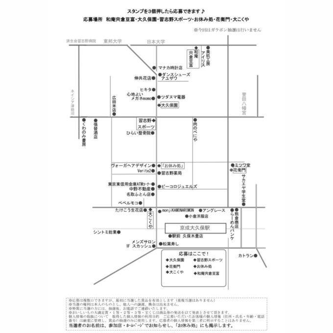 大久保商店街歳末スタンプラリー開催 2023年11月24日 応募期間 2023 年12 月1 日(金)~2023 年12 月22 日(金) 公開抽選会日時 2023 年12 月24 日(日) 午後3 時~ 「大久保商店街 お休み処」 応募方法 下記地図に記載の参加店舗で買物・飲食・サービス等ご利用をした後、店印を所定の場所に押して貰います。3店舗の店印を集め必要事項を記載し、応募箱に入れてください。(1枚の用紙に同一店舗印が複数ある場合、店舗印の切り貼り、サイン、参加店以外の印は無効になります) 応募箱設置場所 大こくや・お休み処・習志野スポーツ・大久保園・和庵 みなさまのご参加をお待ちしています! « 前の記事11月25日(土)26日(日)楽市開催します! » 次の記事谷津遊路商店街歳末福引セール開催