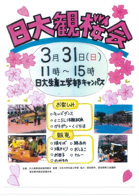 日大観桜会🌸 2024年3月18日 日大観桜会 日時 3月31日(日)11時~15時 会場 日大生産工学部キャンパス キッズダンス・ミニSL試乗・ガラポンなど楽しい企画と 焼きそば・綿あめ・お団子におしるこなどなど美味しいもの盛り沢山で 皆さんをお待ちしております。ぜひぜひお越しくださいませ。 « 前の記事3月16日(土)習志野シティFCと一緒にサッカーをして楽しもう♪ » 次の記事ローズフェスタ谷津 バラの音楽のまち♪