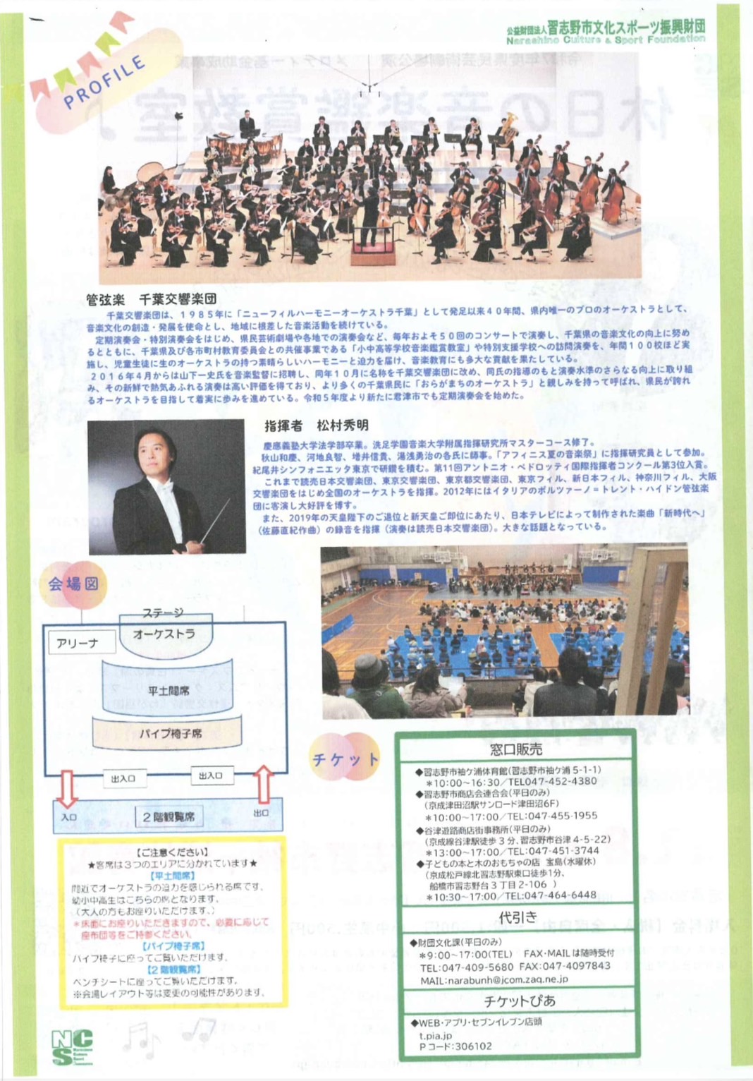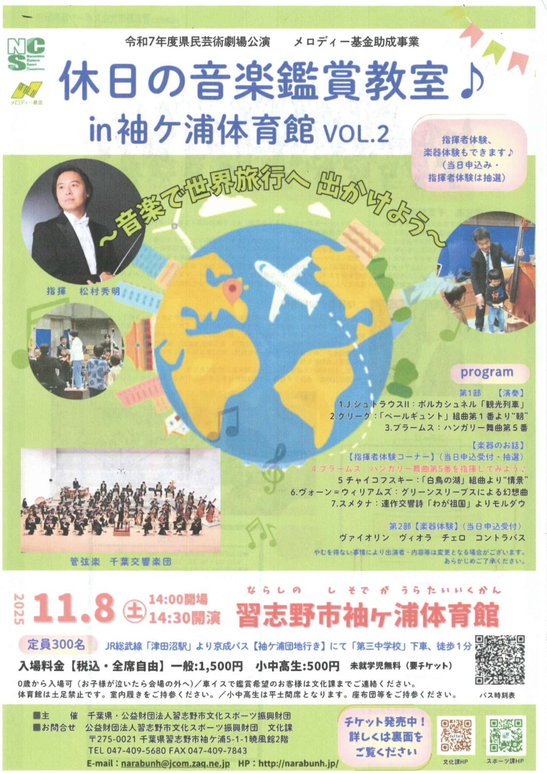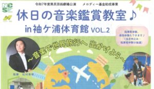 休日の音楽鑑賞教室♪in袖ヶ浦体育館vol.2 2025年8月8日 休日の音楽鑑賞教室 in 袖ケ浦体育館 VOL.2 開催のお知らせ 習志野市袖ケ浦体育館にて、千葉交響楽団による「休日の音楽鑑賞教室 VOL.2」を開催します。 指揮は松村秀明氏。クラシックの名曲を、体育館ならではの臨場感でお楽しみいただけます。 習志野市商店会連合会でチケット販売中!! 平日9:00~17:00 (8/12~8/15夏季休業) イベントに関するお問い合わせ 交易財団法人 習志野市文化スポーツ振興財団 TEL 047-409-5680 « 前の記事2025 実籾ふる里祭り出店受付スタート » 次の記事習志野ラーメンカーニバル2025