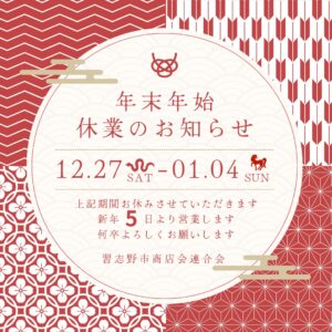 平素より格別のご愛顧を賜り、心より御礼申し上げます。誠に勝手ながら、下記の期間を年末年始休業とさせていただきます。