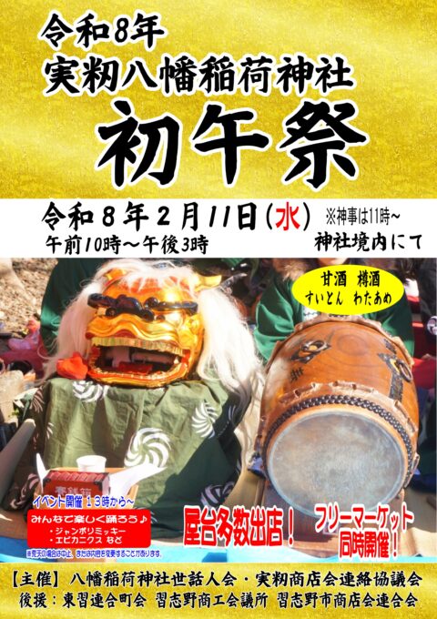 2026年2月11日(水・祝)初午祭(実籾八幡稲荷神社)開催 2026年1月6日 令和8年2月11日(水・祝) 実籾八幡稲荷神社にて「初午祭」を開催します。 フリーマーケットは10時〜15時まで境内で行われます。 甘酒・すいとん・わたあめなどの屋台や、フリーマーケットも同時開催! 13時からはジャンボリミッキーやエビカニクスのステージイベントも。 地域の皆さまのご来場を心よりお待ちしております♪ « 前の記事新年のご挨拶