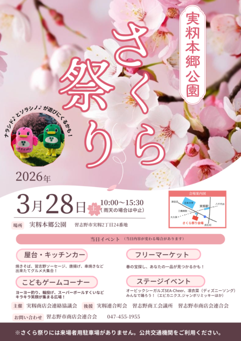 3月28日(土)実籾本郷公園さくら祭り開催 2026年2月17日 2026年3月28日(土) 10:00~15:00 場所:実籾本郷公園 ※雨天中止 皆さまのお越しをお待ちしております。 « 前の記事2026年3月8日(日)津田沼一丁目フリーマーケット開催