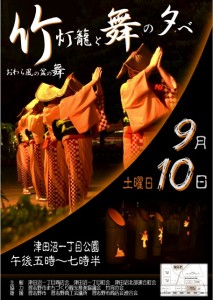 竹灯籠と舞の夕べ 2016.9.10 2016年8月30日 『竹灯籠と舞の夕べ』 2016.9.10(土) 17:00~19:00津田沼一丁目公園 毎年恒例の「竹灯籠と舞の夕べ」夏の終わりに夕涼みにお出かけください 竹灯籠と舞の夕べ プログラム « 前の記事2016.8.27 夏まつり 大久保商店街 » 次の記事2016.10.7~ かつて谷津に映画撮影所があった! 資料展示会と講演会