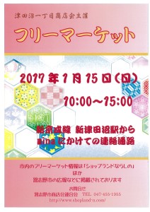 2017.1.15津田沼一丁目商店会フリーマーケット 2017年1月6日 ≪津田沼一丁目商店会主催≫ フリーマーケット 2017.1.15(日)10:00~15:00新京成新津田沼駅改札を出てminaにかけての連絡通路にて 2017.1.15ポスター « 前の記事2017.2.4 チャリティーダンスパーティー » 次の記事2017.1.28/29 楽市フリーマーケット