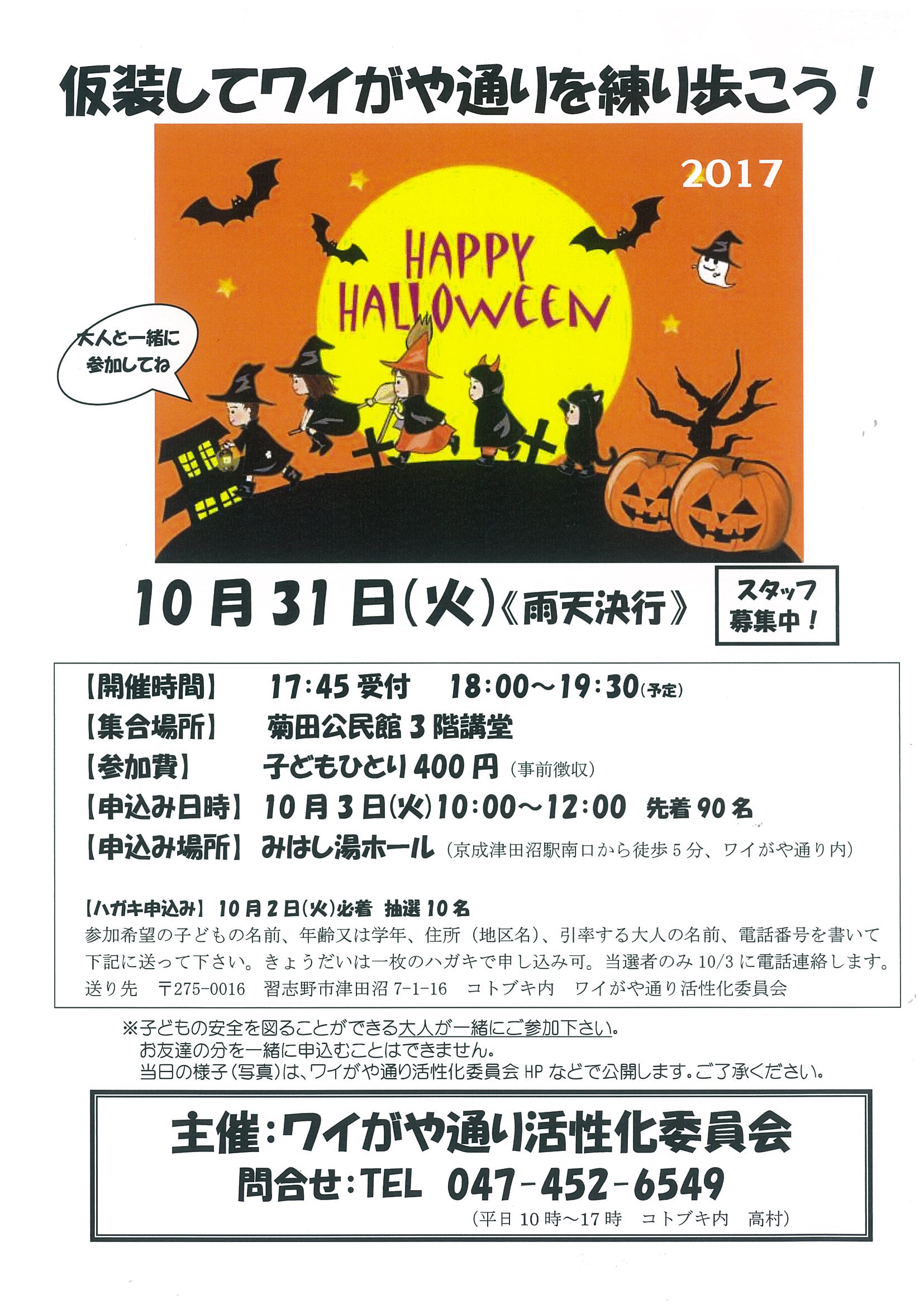 2017.10.31 仮装してワイがや通りを練り歩こう! 2017年10月2日 2017.10.31(火)18:00~19:00(予定) 仮装してワイがや通りを練り歩こう! 2017ハロウィンポスター (1) « 前の記事2017.10.15 実籾コミュニティーロード秋まつり » 次の記事2017.10.21 谷津遊路商店街秋まつり