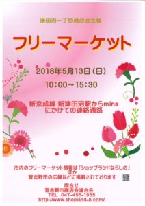 2018.5.13 津田沼一丁目商店会フリーマーケット 2018年4月26日 津田沼一丁目商店会フリーマーケット 2018.5.13(日) 10:00~15:30 新京成津田沼駅からminaへの連絡通路 « 前の記事2018.4/28.29.30 楽市フリーマーケット » 次の記事2018.5.13 新習志野駅前商店会 駅前フリーマーケット