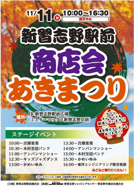2018.11.11 新習志野駅前商店会あきまつり 2018年11月4日 2018.11.11(日) 10:00~16:30 JR新習志野駅前広場 « 前の記事2018.11.3 津田沼南口イルミネーション点灯式 » 次の記事クリスマスコンサート&イルミネーション点灯式(津田沼一丁目商店会)