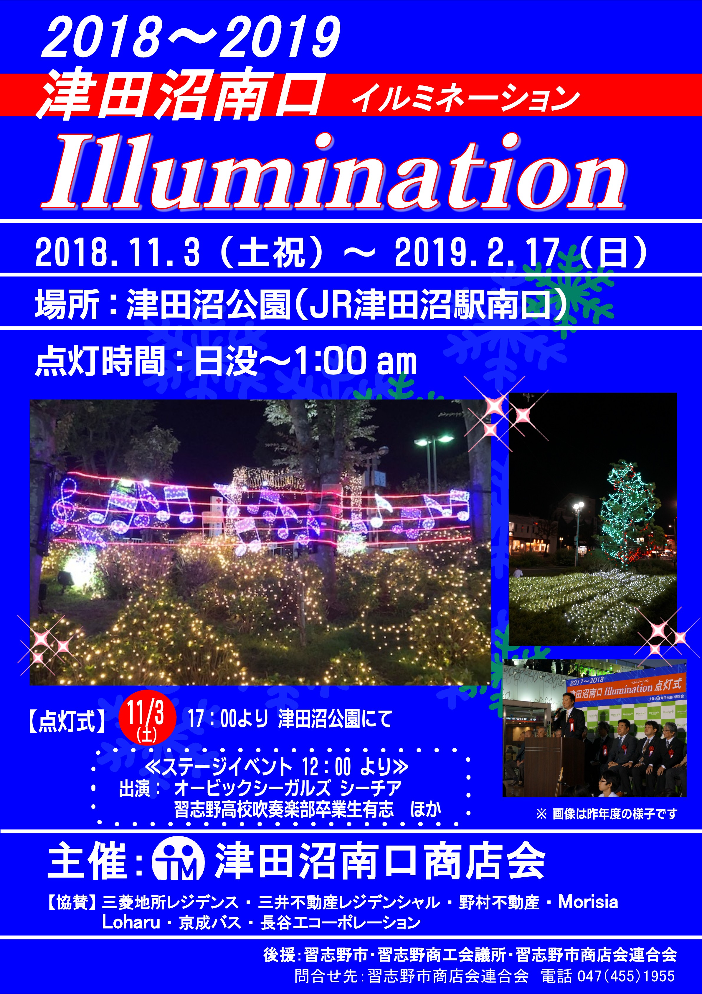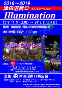 2018.11.3 津田沼南口イルミネーション点灯式 2018年11月1日 津田沼南口イルミネーション点灯式 2018.11.3(土・祝) 17:00~ 津田沼公園 ≪ステージイベント≫ 12:00~12:45 吉澤里美 13:00~13:45 わたももfromたまゆら 14:00~14:45 吉澤里美 15:00~15:45 わたももfromたまゆら 16:00~16:15 オービックシーガルズシーチア « 前の記事2018.11.3 実籾ふる里祭り » 次の記事2018.11.11 新習志野駅前商店会あきまつり