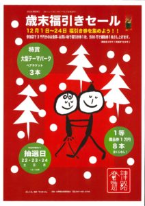 2018.12.22~24 谷津商店街歳末福引セール 2018年11月29日 恒例! 谷津遊路商店街歳末福引セール 福引券配布:12/1~12/24 参加店舗で3,000円のお買い物で福引券1枚 500円のお買い物で補助券1枚を差し上げます。 特賞:大型テーマパーク ペアチケット 3本 1等:商品券1万円 8本 他空くじなし 景品ポスター 参加店ポスター « 前の記事2018.12.8/9 冬の抽選会 新習志野ショッピングセンター » 次の記事2019.2.11 実籾八幡稲荷神社 初午祭