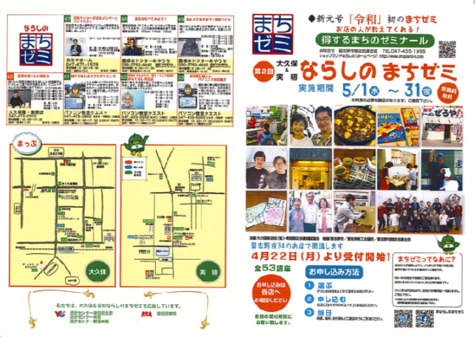 第二回大久保&実籾ならしのまちゼミ 近日 チラシ配布予定です 2019年4月15日 『第二回大久保&実籾ならしのまちゼミ』 近日中にチラシ配布予定です!! チラシは各実施店舗店頭、公民館、図書館など、読売新聞、朝日新聞、地域新聞折込 にて近日中に配布いたします。 受講のお申し込みは4月22日から 受講する店舗にて電話にて受付いたします。 « 前の記事鳥人間コンテスト連続日本一!! 実機見学会 » 次の記事きらおどりコンテスト 出場者募集