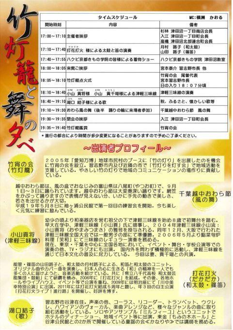 2019.9.7 竹灯篭と舞の夕べ 2019年8月22日 竹灯篭と舞の夕べ 2019年9月7日(土) 17:00~19:30 津田沼一丁目公園 « 前の記事2019.7.27/28 いきいき津田沼夏まつり » 次の記事2019.8.31 谷津商店街 星まつり