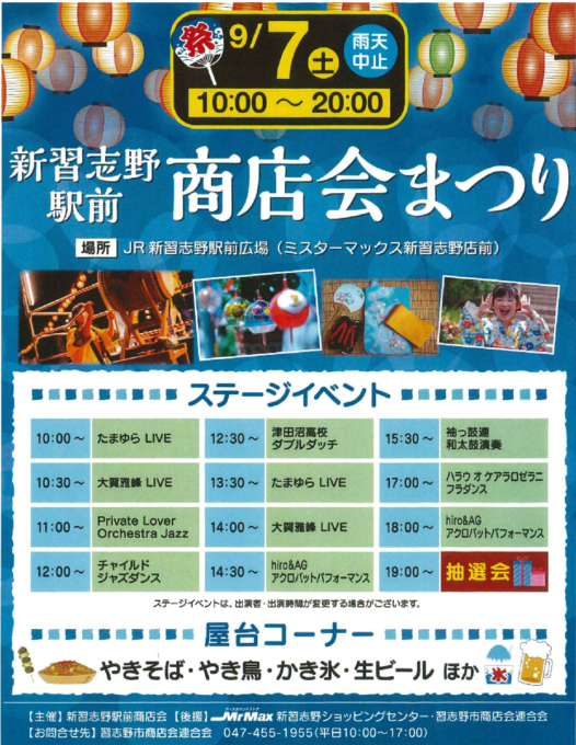 2019.9.7 新習志野駅前商店会まつり 2019年9月6日 新習志野駅前 商店会まつり 2019.9.7(土)10:00~20:00 JR新習志野駅前広場 (ミスターマックス新習志野店前) « 前の記事2019.8.31 谷津商店街 星まつり » 次の記事2019.11.3 実籾ふる里祭り