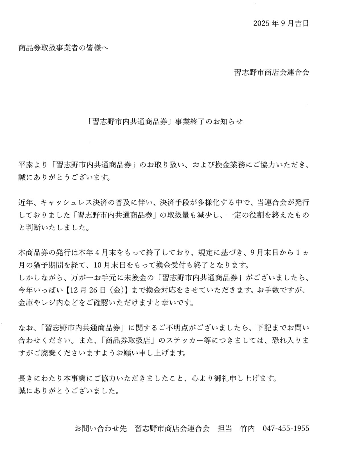 習志野市内共通商品券事業終了のご案内